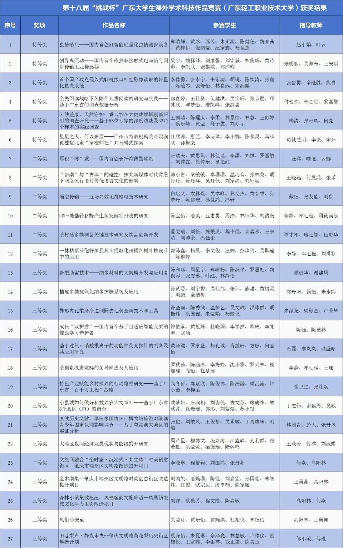 5月17日—19日,团省委、省教育厅、省科学技术厅、省科学技术协会、省社会科学院、肇庆市人民政府共同主办的第十八届“挑战杯”广东大学生课外学术科技作品竞赛终审决赛于肇庆顺利举办。学校的27项作品从全省161所院校的2074件参赛作品中脱颖而出,分别获得特等奖6项、二等奖7项、三等奖14项,获奖总数、特等奖获奖总数、团体总分均位居全省高职第一,获得优秀组织奖并实现连续七届蝉联“优胜杯”奖项。