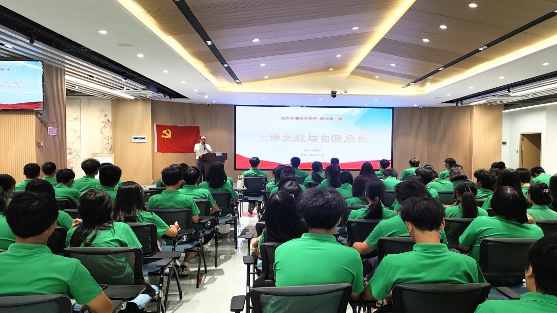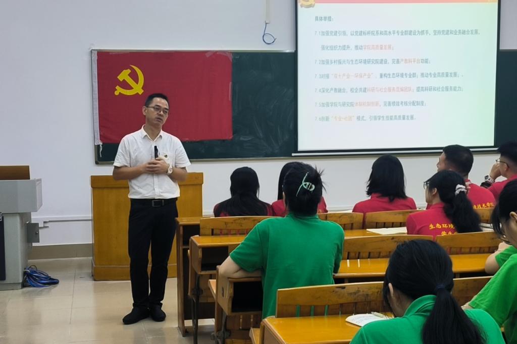 院长黄华枝在教学楼2208,面向21级、22级学生代表,主讲“深入学习党的二十大精神,奋进绿色发展新征程”主题思政第一课。他重点解读了党的二十大报告中“推动绿色发展,促进人与自然和谐共生”内容,介绍了我院在建设国内一流的生态环境专业群,培养德能兼备、德技并修的生态环境守护者方面所作的努力和取得的成效。他强调,生态环境没有替代者,用之不觉,失之难存,必须像保护眼睛一样保护生态环境,像对待生命一样对待生态环境。希望同学们全面发展、立志成才,练就专业本领,积极参加科研项目和社会实践,将专业知识运用到美丽中国建设当中,努力成为在中国式现代化生态文明建设进程中的栋梁之才。