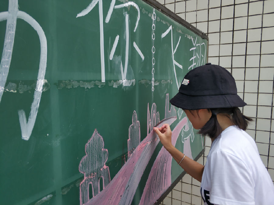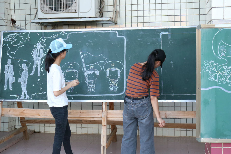 烈日当头,热浪滚滚,不过都阻挡不了我院学子们那满腔热血的激情。在确定完绘画地点后,他们小队成员开会确定了各自分工。经过网上查找资料以及根据我校下发出来的资料,最终确定了整个黑板报的大致排版。然后就此开始了板报工程。本已大致完成的板报轮廓被一场突如其来的大雨冲刷得一干二净。但这意想不到的情况并没有减退了学子们的工作热情。他们重拾信心,重新对板报进行制作。并且为了防止再次出现这情况,他们对绘画材料进行了改进以及将画完的板报搬移到行政楼下。
