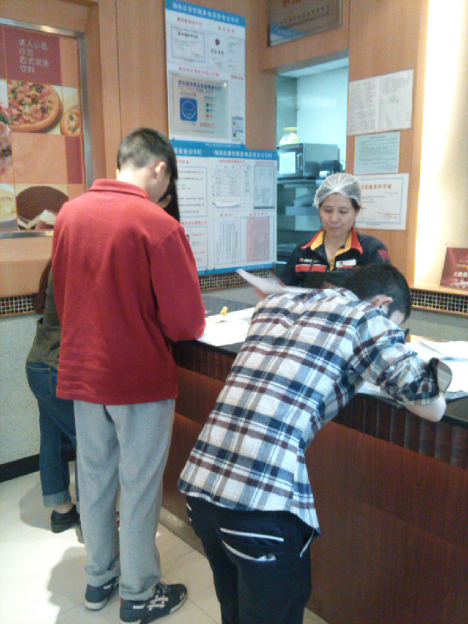 首先,同学们都按照规定的时间到店里集中,建兵师兄(广州必胜宅急送金谷点总经理)带领他们,为他们介绍百胜集团的基本情况,观看了关于食品安全的视频,视频里重点突出了食品来源的安全和操作过程的清洁!然后进行入职签文件的签名,因为百胜餐饮是外企,所有文件都是按照劳动法进行的,所以同学们都很放心的签署文件。签署文件后建兵师兄将师弟师妹分为两个队:广州必胜宅急送骑手队和广州必胜宅急送内场队。同时建兵师兄也多有照顾师弟师妹,安排我们的实践队员只需上中班,不用上晚班。