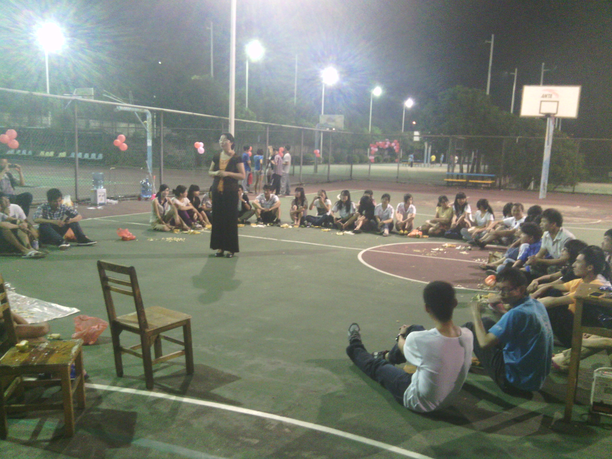 南海校区学生运动场篮球场点缀着各式气球,形成了中秋节气氛。游园分“拍七令”、“投篮”、“抢板凳”、“夹气球”等四个不同主题游戏,共有95名假日留校学子参加,轻化工程系党总支书记马丽南老师、环境工程系副主任陈燕升老师等参加了活动,游园活动从晚上7点半开始持续至晚上10点。
