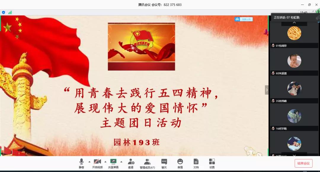 为激励和引领广大团员青年时刻牢记习近平总书记嘱托,继承和发扬五四精神,坚定理想信念,站稳人民立场,练就过硬本领,投身强国伟业,自觉在党和人民最需要的地方绽放青春,为实现中华民族伟大复兴中国梦贡献青春力量,5月4日晚上8:30-10:00,园林193班在线上开展了“用青春去践行五四精神,展现伟大的爱国情怀”主题团日活动。我校副校长廖俊杰、学院党总支书记孙林山、学院分团委书记罗雪榕出席了此次活动。