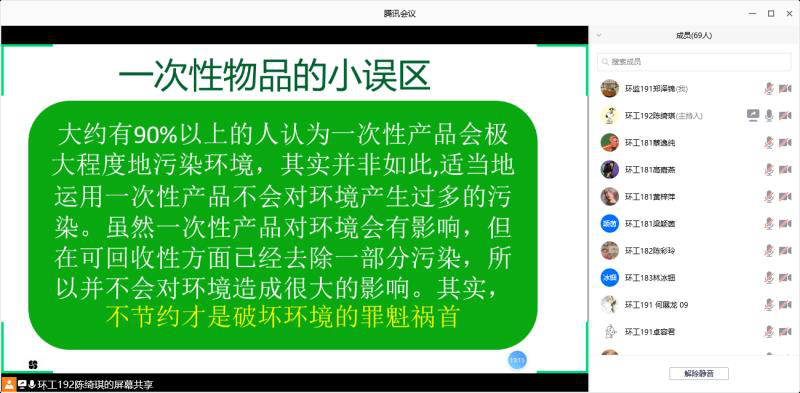 2020年6月21日14:00,生态环境技术学院青年志愿服务队在腾讯会议线上开展了第二期的环保宣讲活动。此次活动的目的是为了让同学们对一次性用品能有全新的认识,让减少一次性用品的使用,节约资源,保护环境,建设美丽绿色家园成为大家的共同意识。