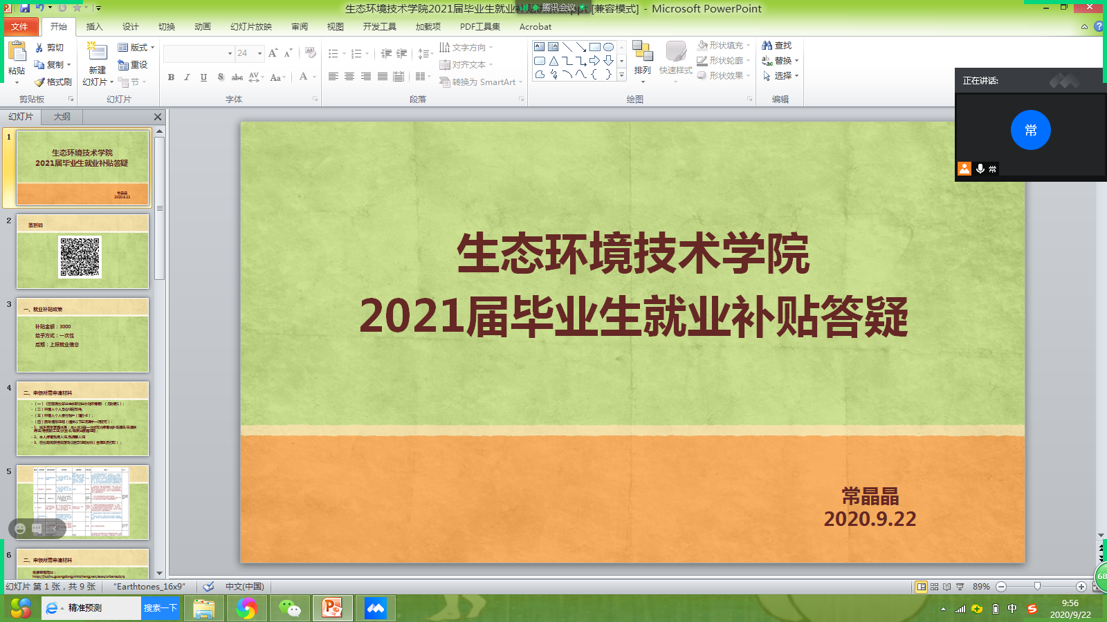 2020年9月22日,为使毕业生更加清楚求职补贴申领的条件,常晶晶老师开展了“生态环境技术学院2021届毕业生求职补贴申领答疑会”。