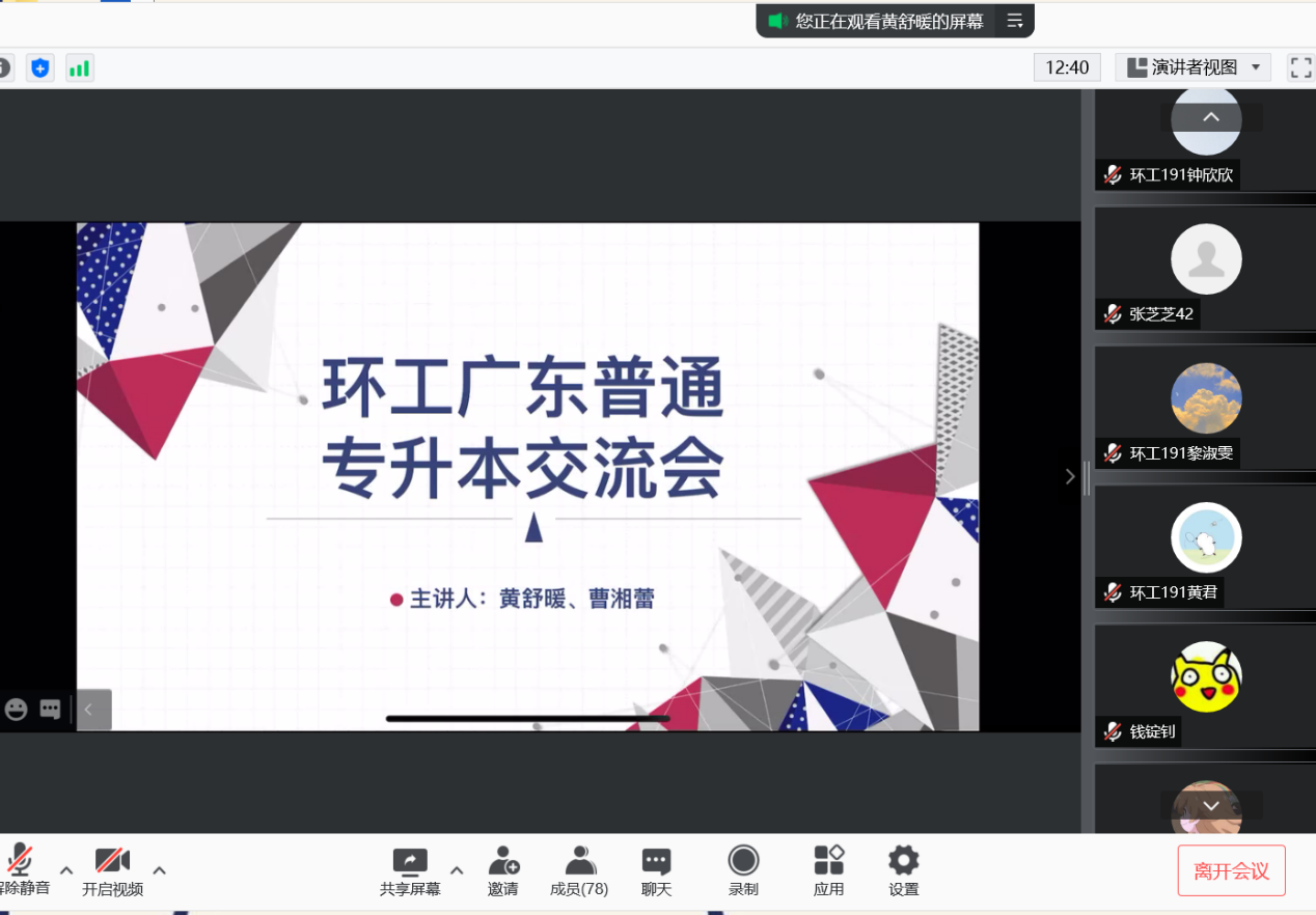 为了让同学们了解专升本考试,为备考升本作准备,生态环境技术学院于10月23日下午2点在腾讯会议举行环境工程技术专升本交流会,本次交流会有幸邀请到升本上岸的黄舒暖师姐和曹湘蕾师姐,为同学们分享专升本备考经验。