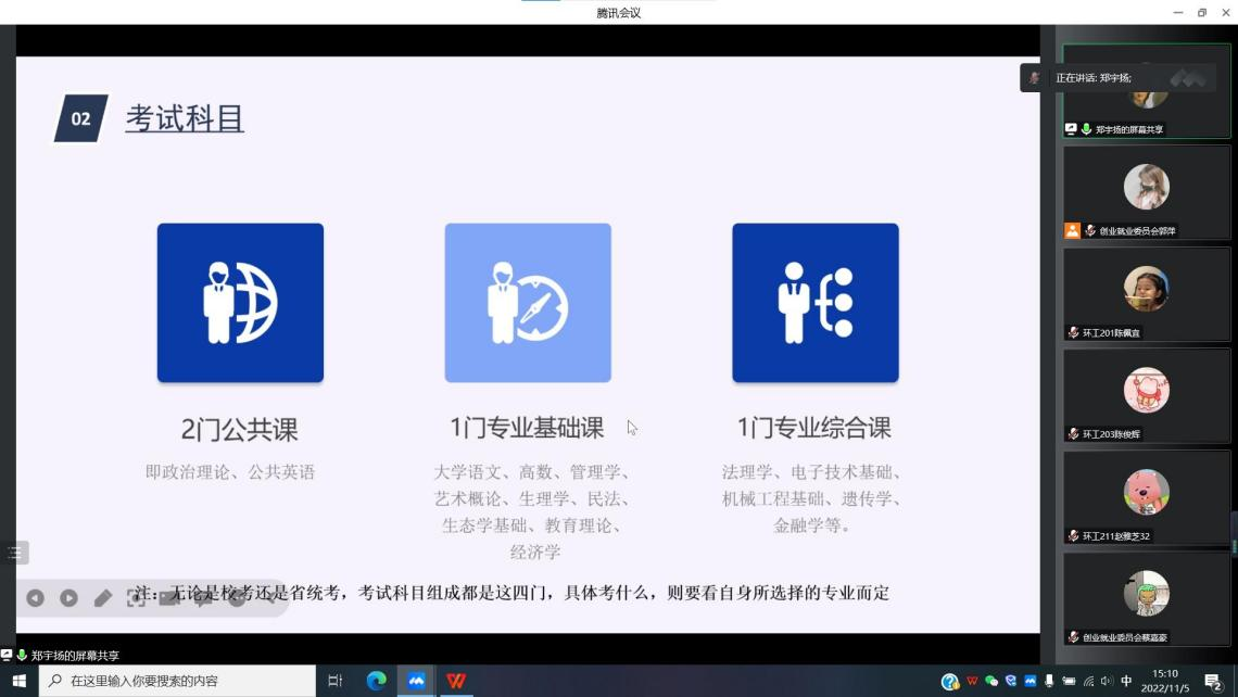 会议开始由郑宇扬师兄为同学们讲解升本考试的考试类型、考试科目、考试时间、重点内容以及其他的注意事项,并为同学们分享了他们备考时所用的资料。郑宇扬师兄和卓容君师姐还结合自己备考的经验,从考试内容、复习方法、时间管理等多个方面向同学们详细讲解如何进行优质的复习,并为同学们逐一解答问题,鼓励同学们要持之以恒。