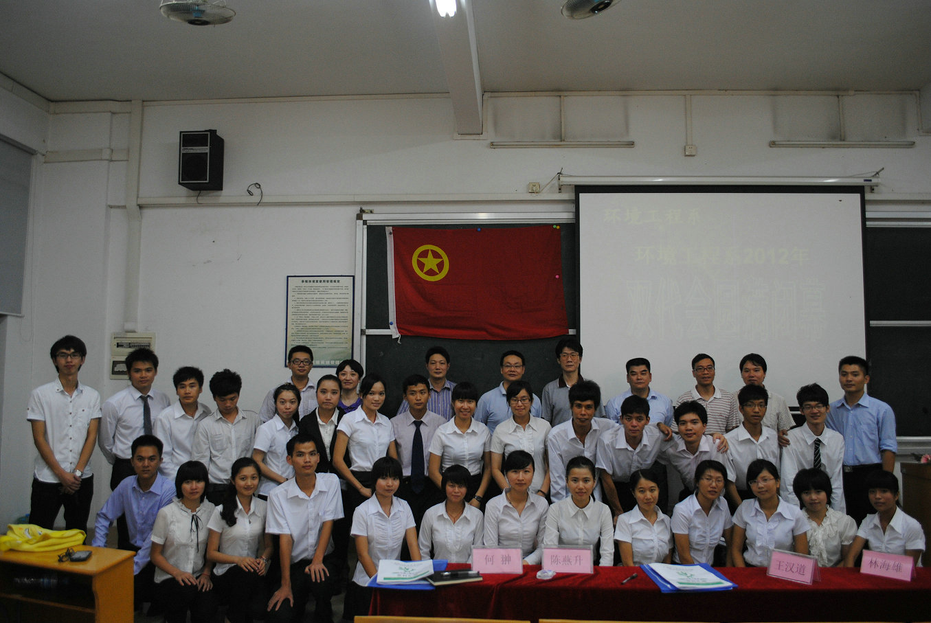 大会审议通过了《环境工程系2011/2012学年团员代表暨学生代表筹备工作报告》等议程,代表投票选举产生了我系2012/2013学年分团委和学生会委员,曹旨东(楼宇101班)、崔健文(楼宇101班)、冯君霞(园林101班)、何嘉泳(楼宇101班)、江家胜(园林101班)、梁嘉勤(楼宇101班)、罗才敏(园林101班)、邱东东(环保101班)、吴桂狄(建材101班)、吴家伯(楼宇101班)、张海强(楼宇101班)、郑莲琴(建材101班)、郑旸 (建材101班)、朱佳鸣(环保102班);陈晓荺(环保111班)、陈逸玲(环保112班)、邓志聪(环保112班)、廖健(建材111班)、林海燕(建材111班)、吴梦影(环保111班)、冼永兰(建材111班)、谢绍伙(环保111班)、许玉英(环保112班)、叶莹莹(楼宇111班)、曾丽婷(园林111班)、张楚添(环保111班)、张洁(园林111班)、郑咏欣(环保112班)等28位同学当选新一届委员。