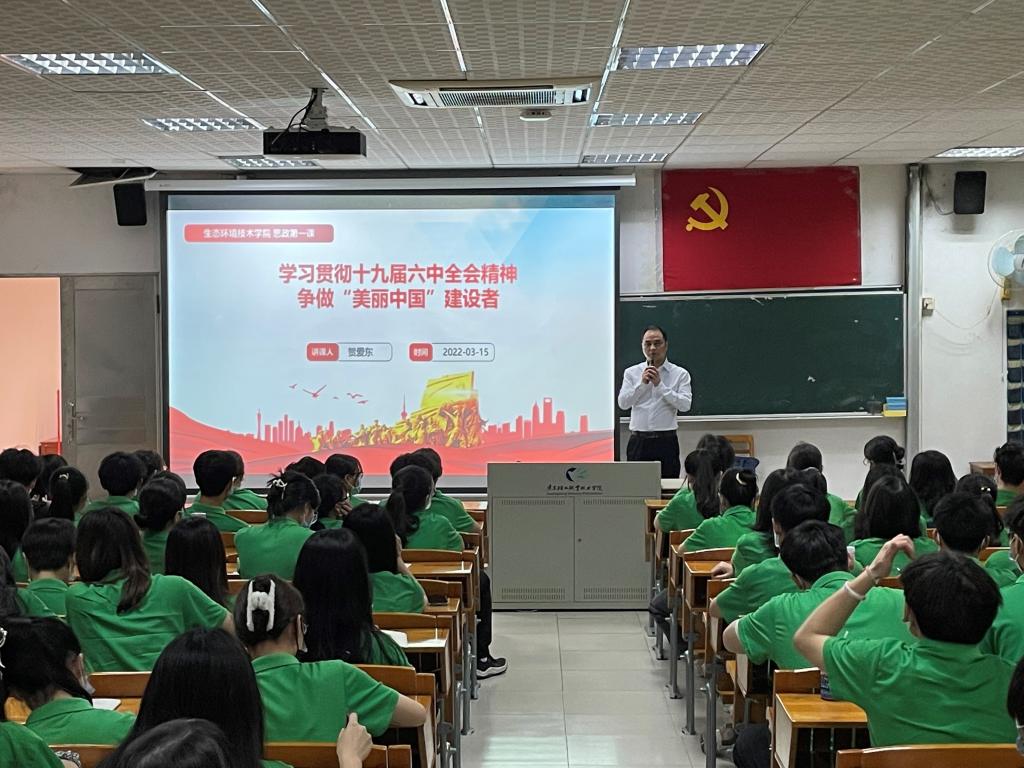 贺爱东在南海南校区4号楼113教室,以“学习贯彻党的十九届六中全会精神,争做美丽中国建设者”为主题,为21级入党积极分子讲课,重点向同学们解读党的十九届六中全会的重要历史意义、介绍党的十九届六中全会的《决议》的主要内容,同时教育和引导大家要树立远大理想、牢牢掌握专业知识技能、践行习近平生态文明思想,立志做美丽中国建设者。