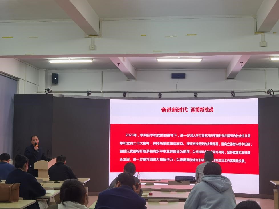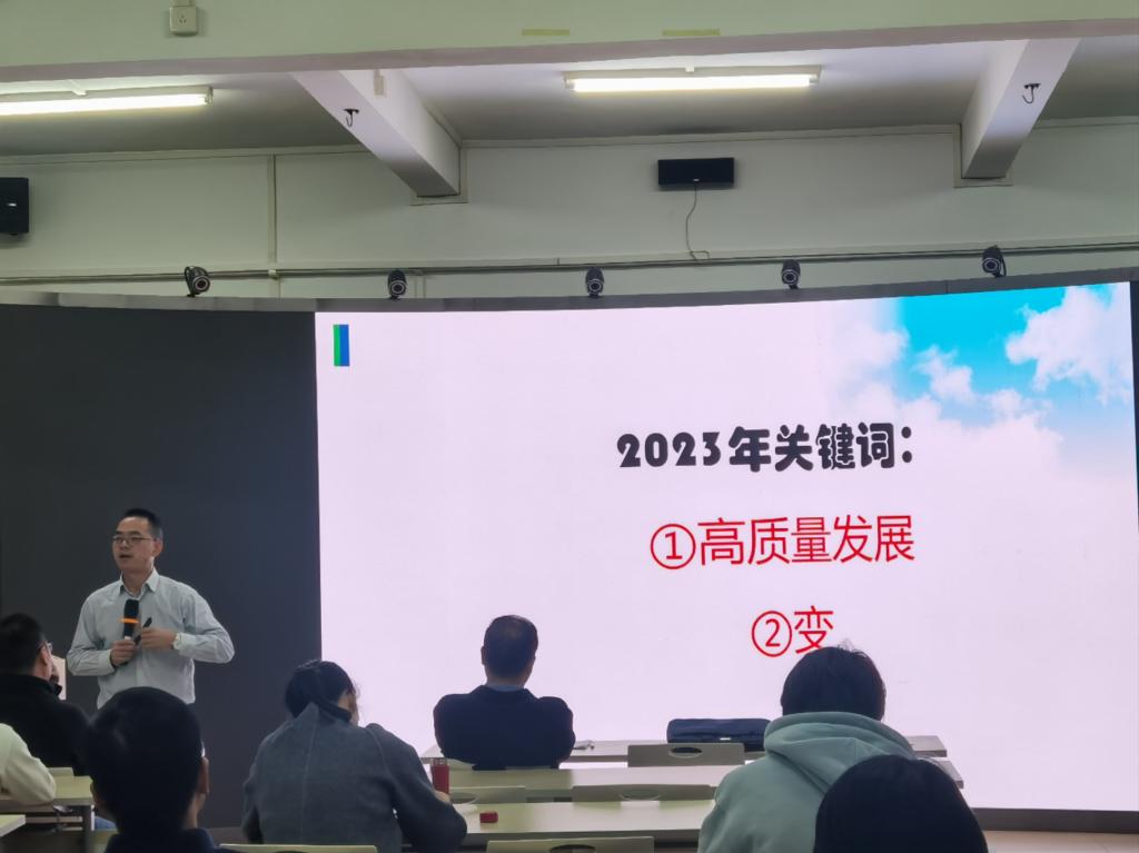 2023年2月13日下午,生态环境技术学院在第四实训楼A401召开了2022-2023学年第二学期第一次全院大会。学院教学副院长张泽敏、科研副院长张堃、分团委书记周东夏分别对新年度教学工作、科研及社会服务工作和学生工作进行了安排部署,以省级高水平专业群标志性成果为导向落实工作。随后,学院院长黄华枝发表讲话,充分肯定2022年学院取得的成绩,鼓励全体教职员工再接再厉,在讲话中提出了两个2023年关键词“高质量发展”和“变”并希望全体教职工抓住机会、主动求变,在新的一年大展拳脚、华丽蜕变。最后,学院党总支书记贺爱东传达学校党委重要会议精神,并以“奋进新时代、迎接新挑战”为主题作新学期动员讲话,结合“识变、应变、求变”鼓励全体教职工在新的阶段适应工作、主动创新、推进学院高质量发展。