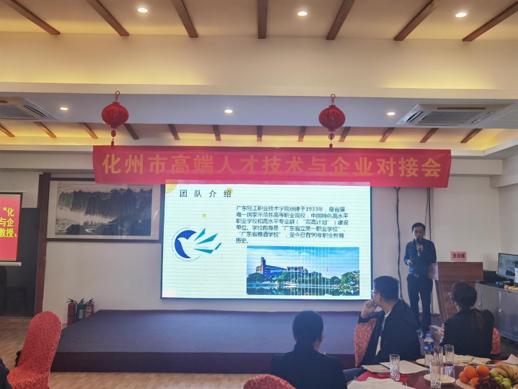 3月2日,由茂名市人才驿站、茂名市科学技术协会、化州市人才驿站等单位联合举办的化州市高端人才技术与企业对接会在化州市杨梅镇举行,30多家科研院所及化州知名企业参会。广东轻工职业技术学院生态环境技术学院院长黄华枝教授、食品与生物工程学院生化健康产教科联合中心主任黄小波教授等4位专家代表参会,学校驻平定镇村第一书记易广、队员吴锦传陪同参会。