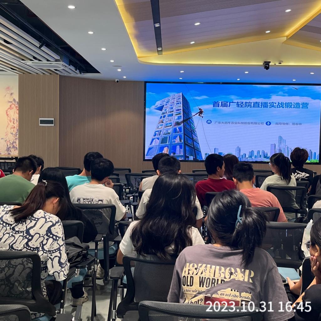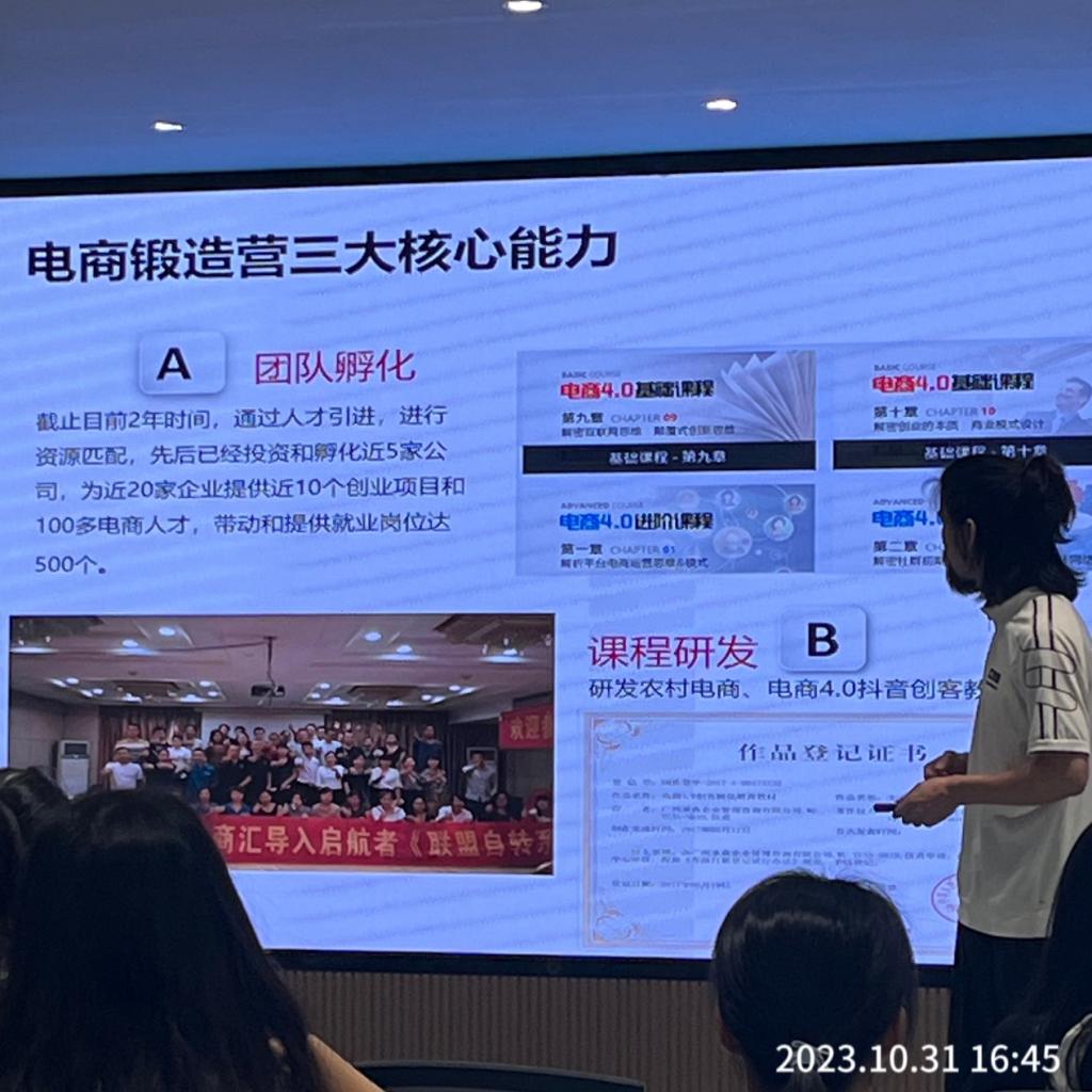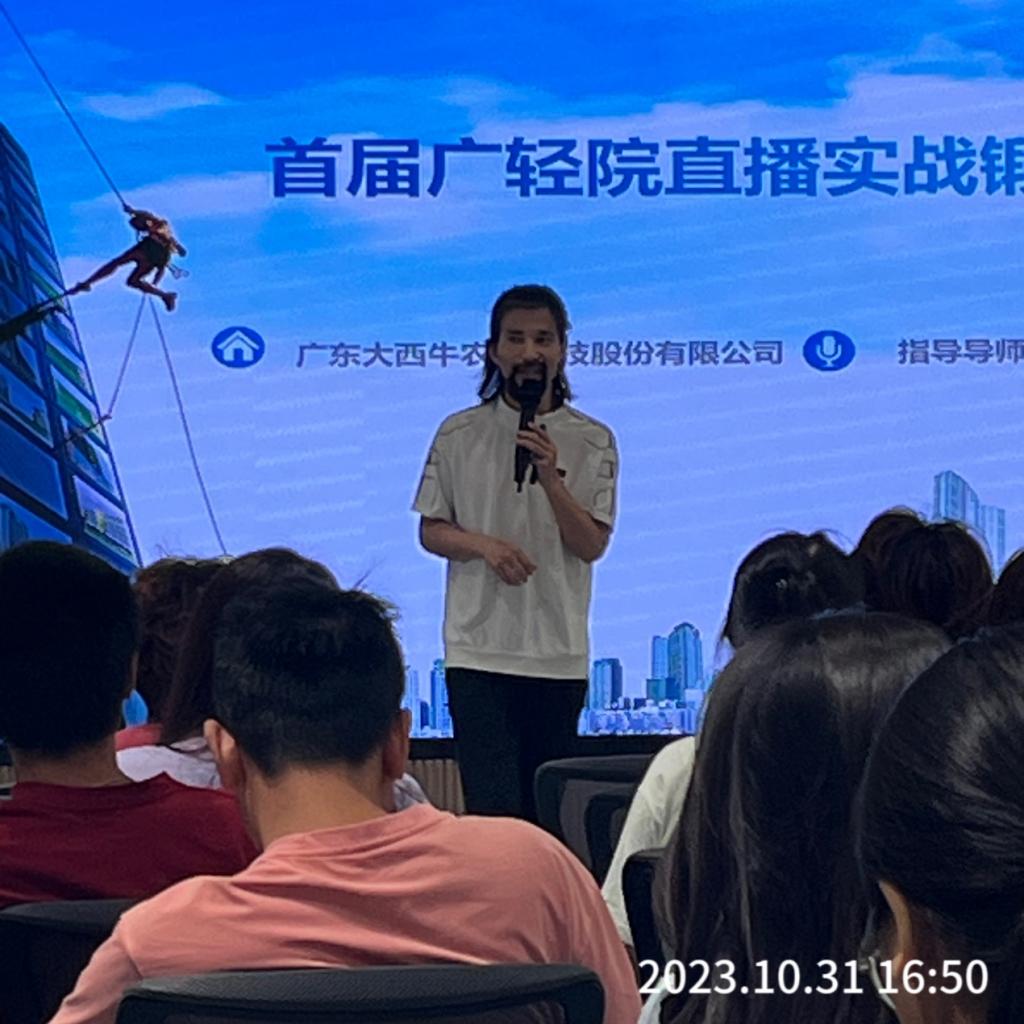 2023年10月31日在我校国风馆,广东地龙皇公司开展宣讲会并组织直播带货团队合伙人招募,企业代表范总,学院党总支副书记齐正学、园林专业教研室主任高阳林、专业辅导员黄炜出席此次会议。