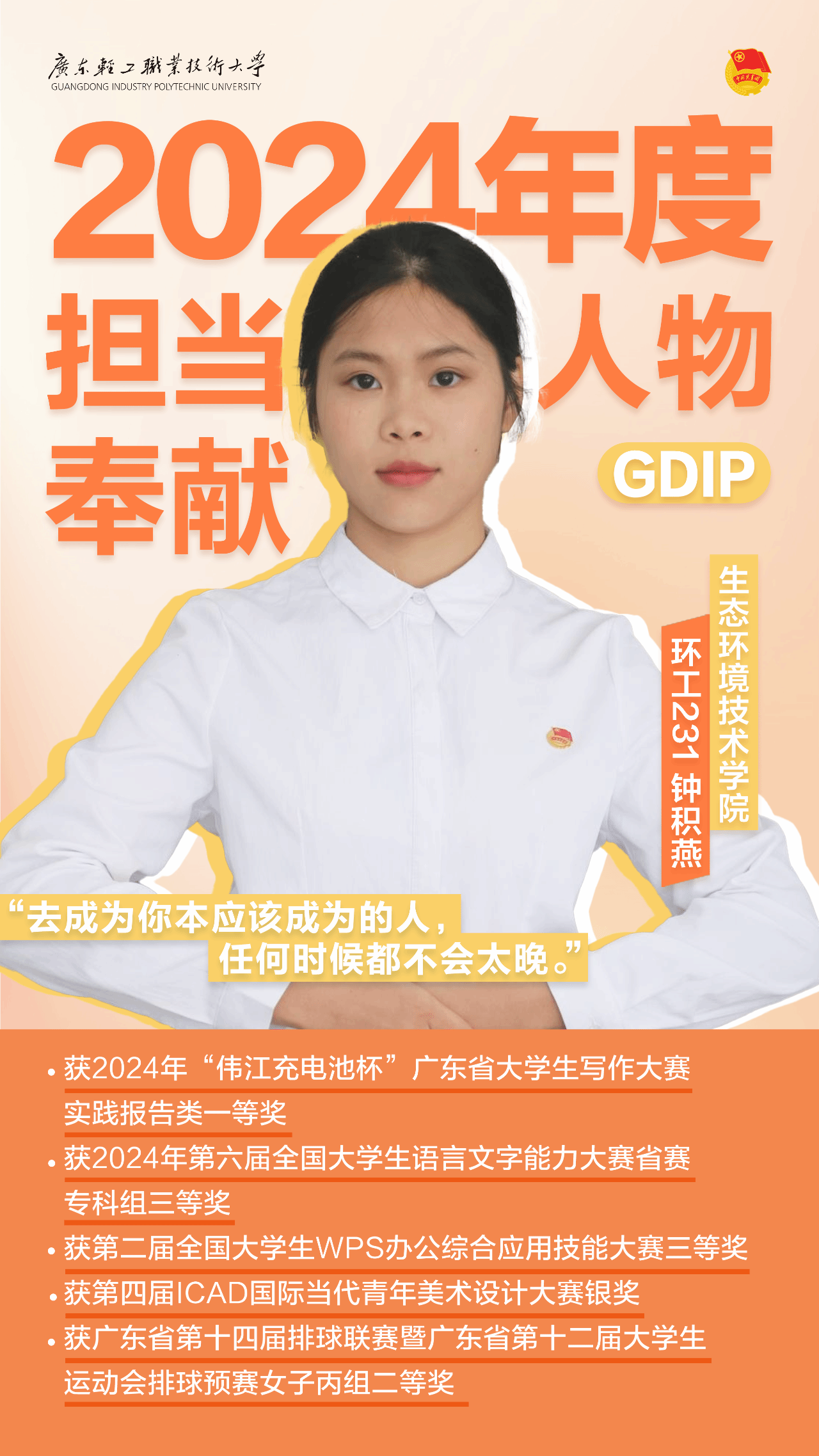 钟积燕同学获评2024年度感动广轻——年度担当奉献人物